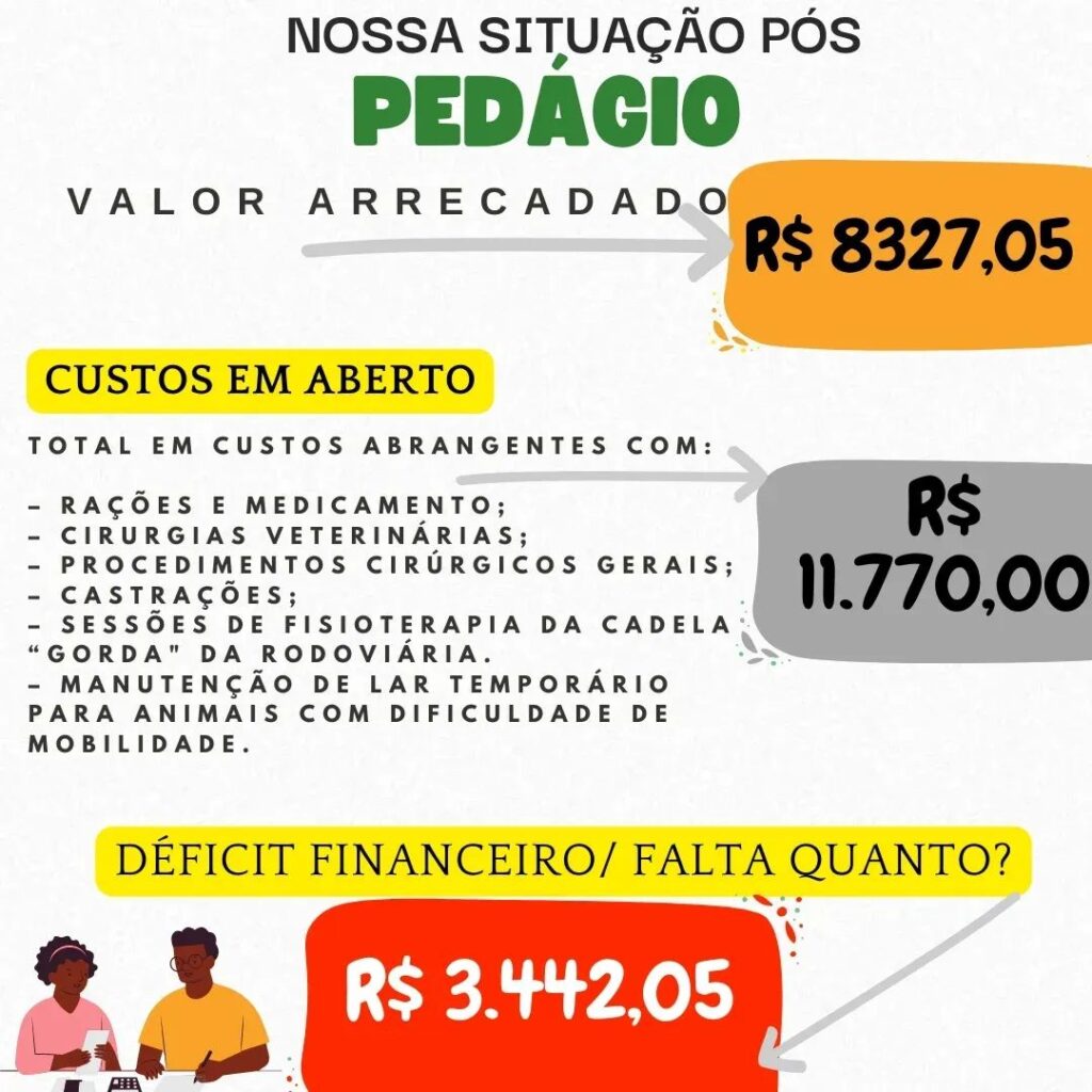 Apesar do valor expressivo, os voluntários explicam que o déficit financeiro da Appasfa, ou seja, as dívidas acumuladas com os tratamentos e alimentação dos animais, ainda é superior, ultrapassando os 11 mil reais antes do pedágio.
