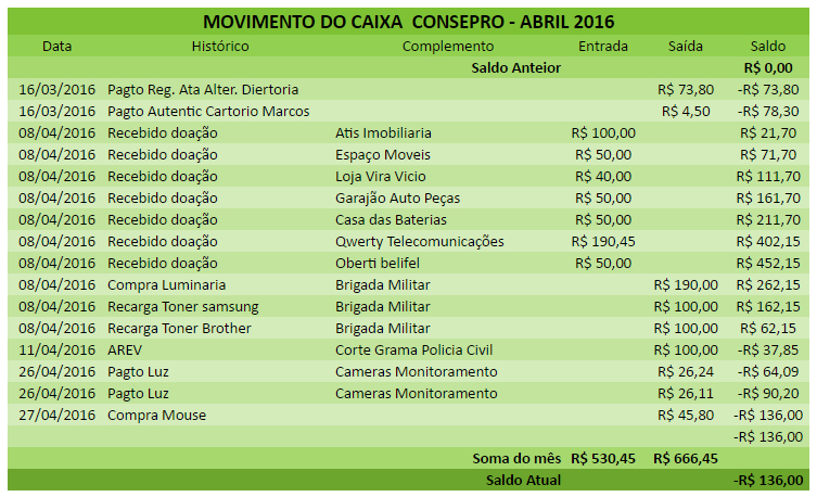 Isso mostra que o Consepro está iniciando sua gestão com transparência e muita dedicação. A diretoria divulgou o movimento do caixa do conselho para que a comunidade acompanhe o trabalho que está sendo desenvolvido logo nesse início de gestão.