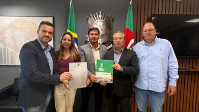 O prefeito Guiga, o presidente da Câmara de Vereadores e policial Patrício Antunes e o presidente do Consepro, Marcos Brum,…
