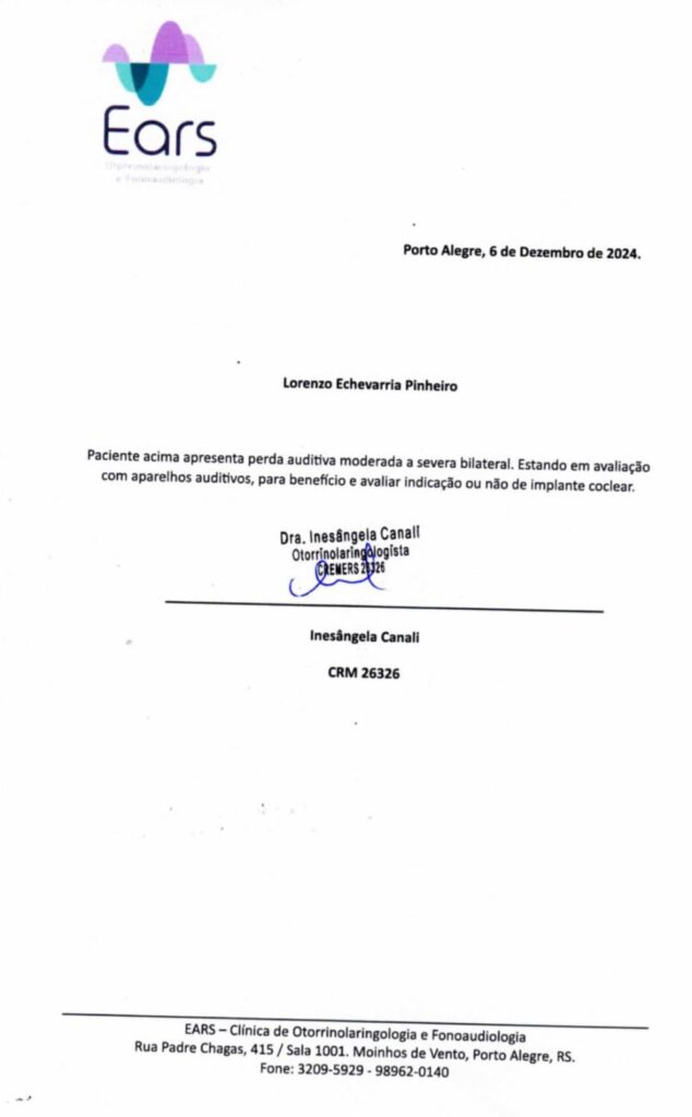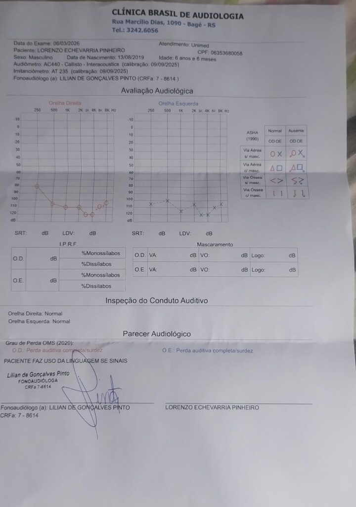 Diante dessa realidade, surgiu uma esperança para transformar sua vida: a aquisição de um aparelho auditivo que pode permitir que ele escute sons, vozes, músicas e as brincadeiras do dia a dia.