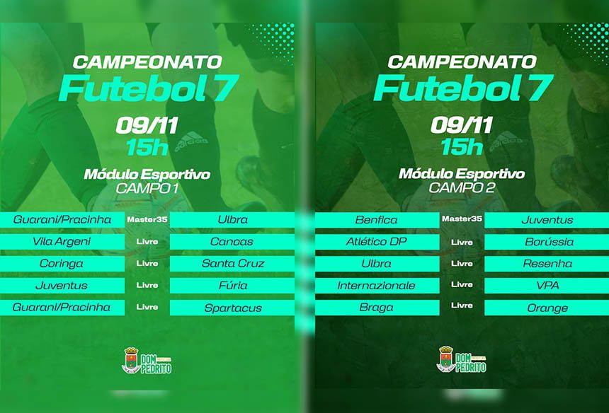 O Campeonato Municipal de Futebol 7 segue movimentando o calendário esportivo de Dom Pedrito. Neste domingo, 09 de novembro, a partir das 15h, o Módulo Esportivo recebe mais uma rodada de jogos, divididos nos campos 1 e 2, envolvendo equipes das categorias Livre e Master 35.