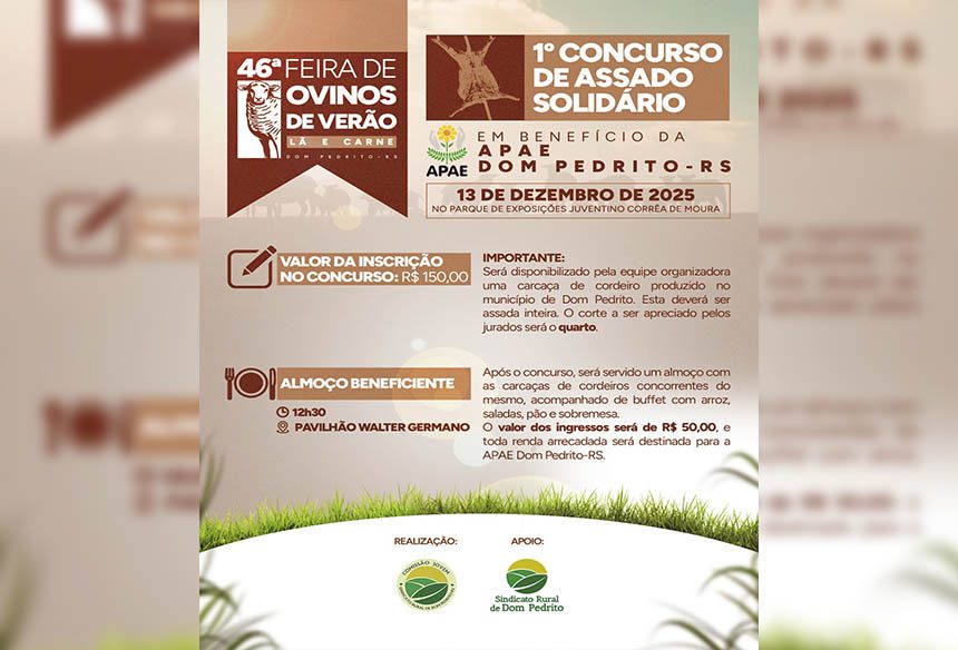 A Comissão Jovem do Sindicato Rural de Dom Pedrito realizará, no dia 13 de dezembro, uma programação especial que une tradição, gastronomia e solidariedade. O evento, que integra a 46ª Feira de Ovinos de Verão – Lã e Carne, contará com o 1º Concurso de Assado Solidário e um almoço beneficente, com toda a renda destinada à APAE Dom Pedrito-RS.