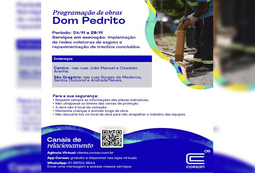 Para outras informações ou atendimentos, estão disponíveis os canais da Corsan: Aplicativo Corsan, Agência Virtual, WhatsApp (51) 99704-6644 e telefone 0800 646 6444.
