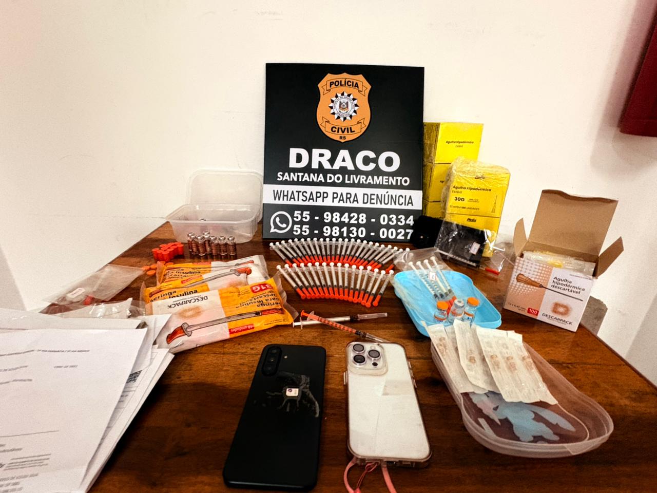 Na manhã desta quinta-feira (5), a Delegacia de Repressão às Ações Criminosas Organizadas (DRACO) de Sant’Ana do Livramento prendeu duas mulheres suspeitas de confeccionar e comercializar canetas emagrecedoras ilegais no município. A ação contou com o apoio da Vigilância Sanitária Municipal.