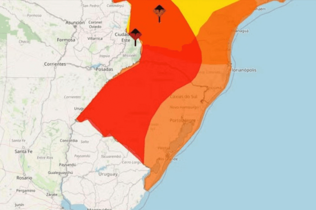 O aviso se intensifica para algumas regiões. Da manhã de domingo até a madrugada da segunda, há alerta vermelho de grande perigo por tempestades para toda a fronteira, parte da região norte, central, sul e serrana. A previsão de acumulados de chuva maiores que 100 mm/dia, ventos superiores a 100 km/h e queda de granizo.