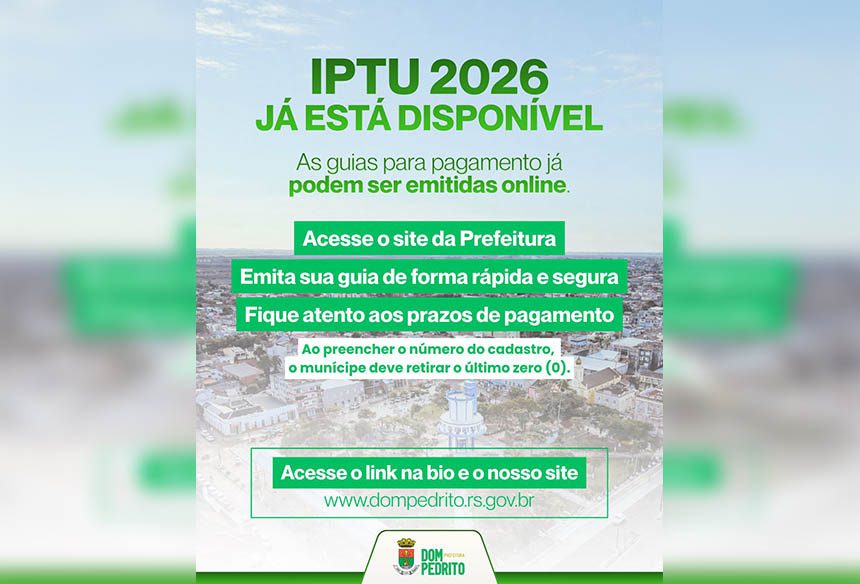 Para emitir a guia do IPTU 2026, basta acessar www.dompedrito.rs.gov.br (ou o link disponível na bio do Instagram oficial da Prefeitura de Dom Pedrito).