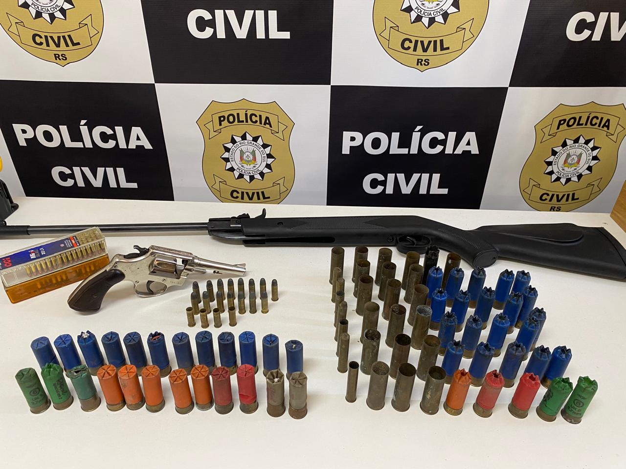 Em um dos endereços vinculados ao investigado, os policiais localizaram e apreenderam um revólver calibre .38, marca Taurus, sem registro no sistema da Polícia Civil, além de uma arma aparentemente de pressão adaptada para o calibre .22. Também foram apreendidas 24 munições de calibre .12, 15 munições de calibre .38, 132 munições de calibre .22, bem como diversos estojos de calibres .38, .12 e .36.
