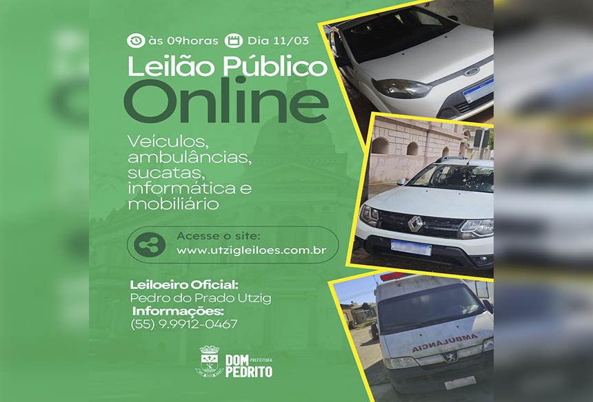 A Prefeitura de Dom Pedrito realizará, no dia 11 de março de 2026, às 9h, um Leilão Público Online para a venda de bens móveis inservíveis pertencentes ao patrimônio municipal.