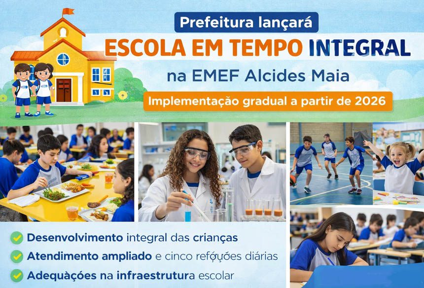 A Prefeitura dará início à implantação do modelo de Escola em Tempo Integral na EMEF Alcides Maia, com implementação gradual a partir do próximo ano letivo. A proposta tem como objetivo assegurar o desenvolvimento integral das crianças, ampliando o tempo de permanência na escola com qualidade pedagógica, alimentação adequada e melhorias estruturais.