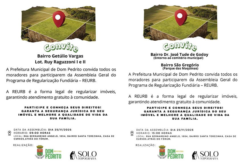 A Prefeitura de Dom Pedrito, em conjunto com a empresa Solo Topografia, está convidando os moradores dos bairros Getúlio Vargas, Ruy Raguzzoni I e II, Dr. José Tude de Godoy (área próxima ao cemitério municipal) e São Gregório (região do parque de máquinas) para participar das Assembleias Gerais do Programa de Regularização Fundiária – REURB. A proposta é orientar a população sobre como regularizar seus imóveis dentro da legislação, sem qualquer custo para famílias de baixa renda.